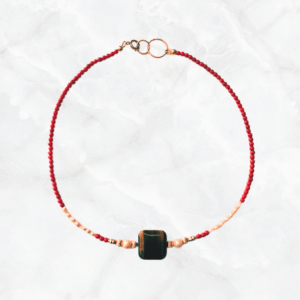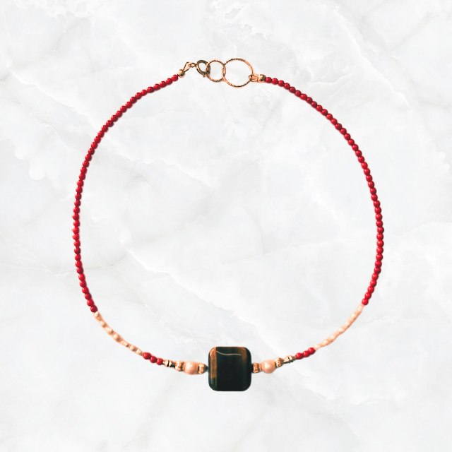 • tijgeroog • goldfilled • oud hollands koraal • parel • totale lengte ketting ca. 45,5 cm