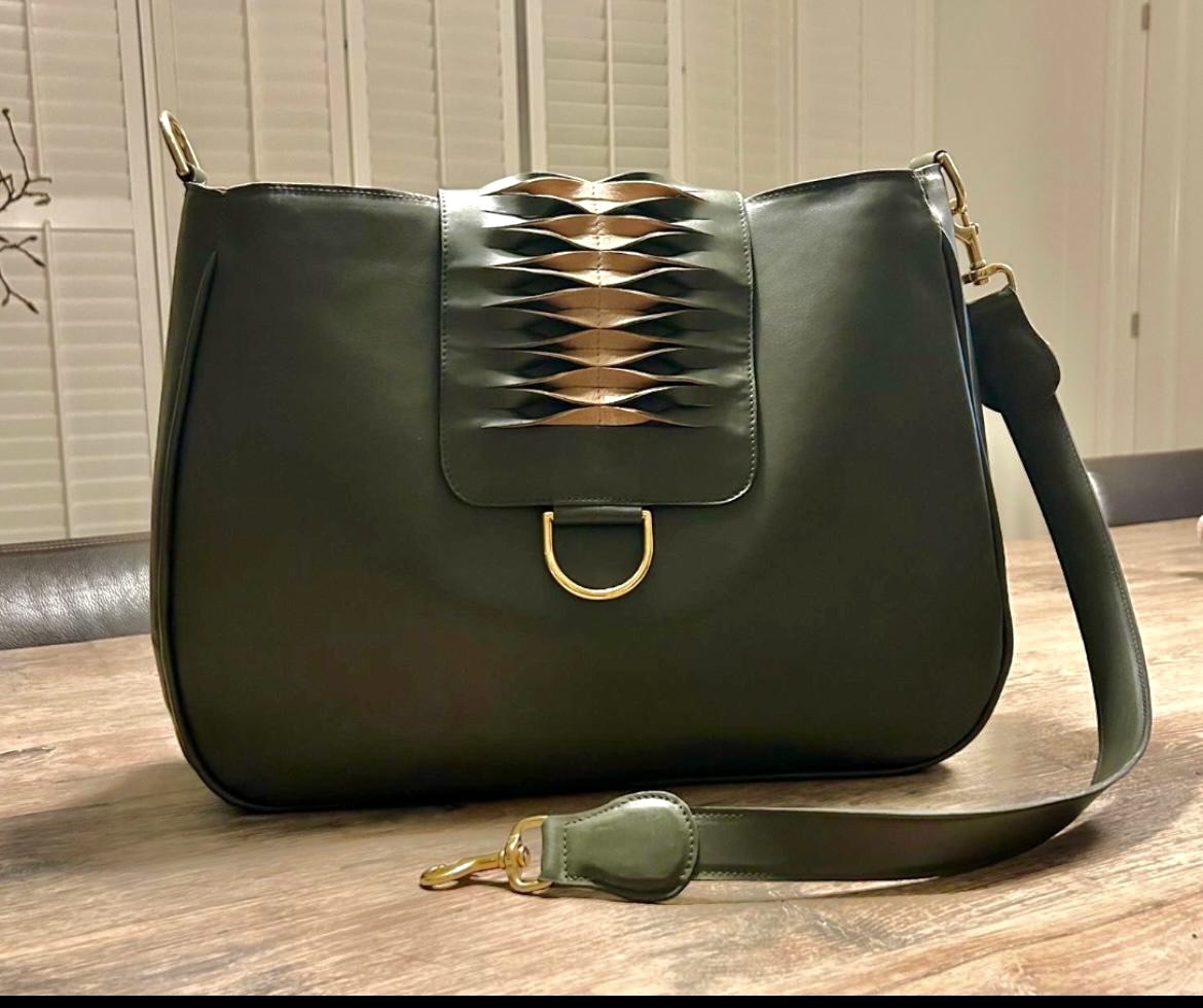 - buitenkant tas en draagband: olijfgroen rundleer